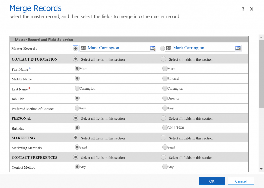 In the merging UI in the web application you can only select values to update that are in the same field on each record, i.e. use Email Address 1 from either the master or subordinate. Using the SDK however, there’s nothing to stop you taking values from elsewhere, or even just making up entirely new values that don’t exist in either record, by populating the UpdateContent parameter of the MergeRequest.