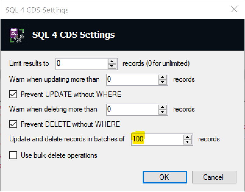You know you can write more than just SELECT statements in SQL 4 CDS? You can now control the number of records that are processed for UPDATE and DELETE in each batch, which can help avoid timeouts if each one takes a long time because of plugins etc. To control the batch size, click on the Settings button in the toolbar:
