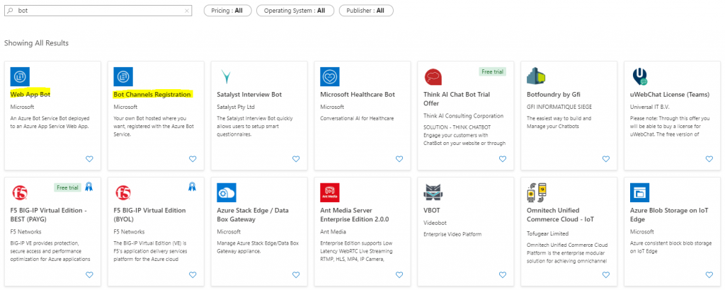 First, in the Azure portal, I created a new resource group to keep everything I’m going to need in one place. Then I click Add Resource and just type in “Bot”. You get quite a few options to choose from: