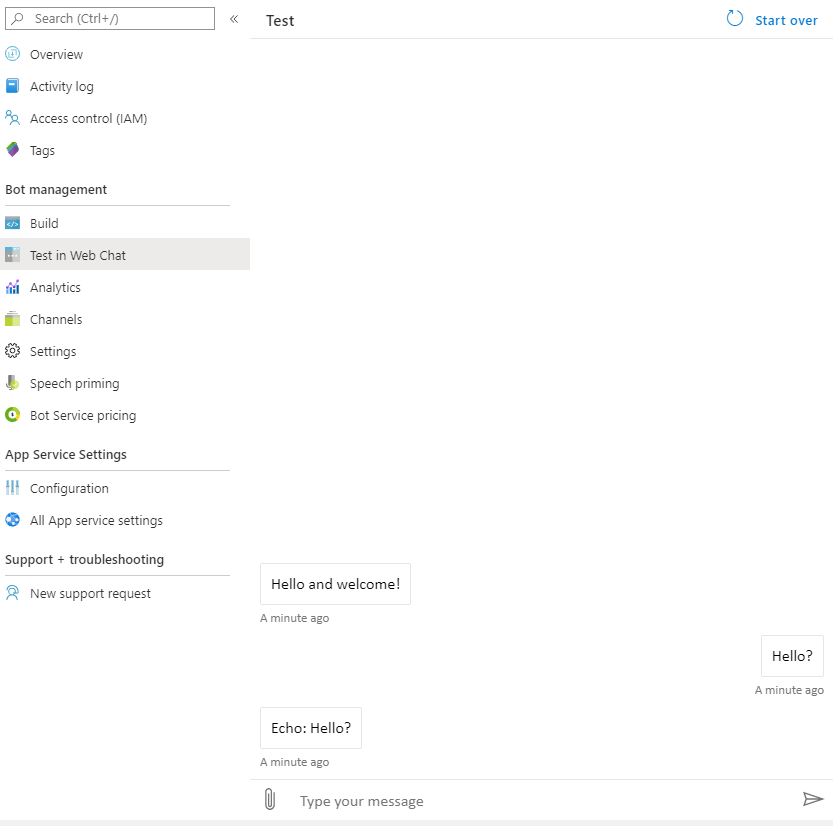 I haven’t written any code yet but I’d like to see it working before I start to change anything. The simplest way is to head over to the Web App Bot resource and click on the “Test in Web Chat” option. This gives me a quick and easy way to interact with my bot.