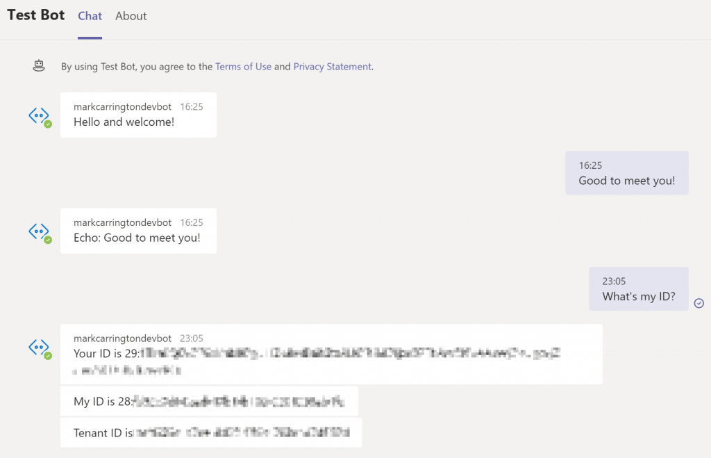 I already know the ID of my bot, but I need to capture the user and tenant IDs. The user ID is not the user’s login name (user@contoso.com) but an apparently random ID assigned by Teams (29:cXh2ZnlWREI2VgpMY3o3UFdGZU9xCnJMUzBScUJqNWIKSlVrZkpaanh0cgpOMEtXVThVSDl)