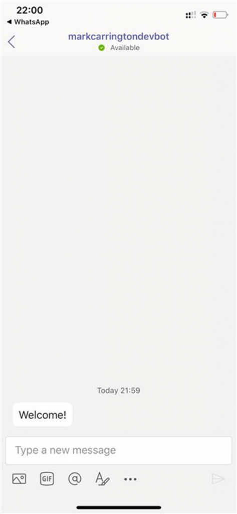 With that sorted my installer runs through and adds the app for each user. That triggers the OnMembersAddedAsync method in my bot, which saves the required IDs to the Azure Table Storage table and sends the welcome message to the user.
