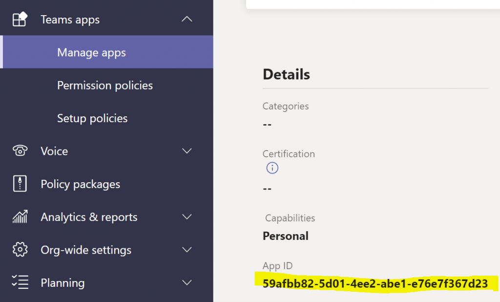 Finally it struck me that I’m trying to install the Teams app which includes my bot, not the bot itself. When I created the Teams app in App Studio originally it asked for an ID to use, and I just clicked the “Generate” button to create a random guid. Thankfully I can easily find the correct guid either in App Studio by selecting to edit my existing app, or by selecting it from the list in the Teams admin center