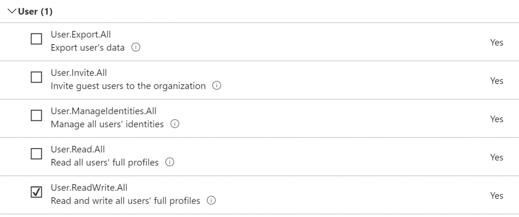This gives me a huge list of all the different permissions that are available in Microsoft Graph. Luckily I only need to grant one, so scroll down to User and select the User.ReadWrite.All one we identified earlier.