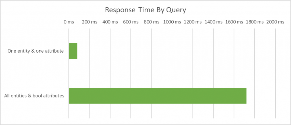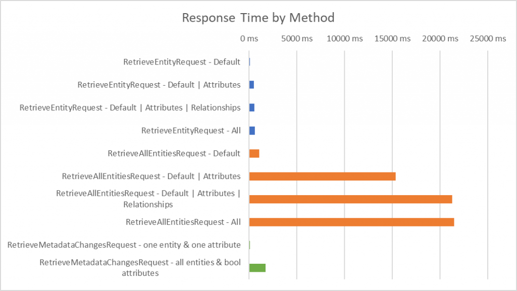 You can see that each extra option adds to the response time, but getting the attributes is the biggest change. This example was run using the account entity which has a lot of attributes so this might not be representative of all entities, but it still highlights the important point: do not ask for more information than you need!
