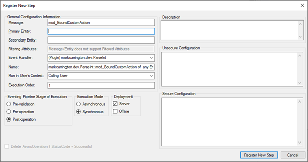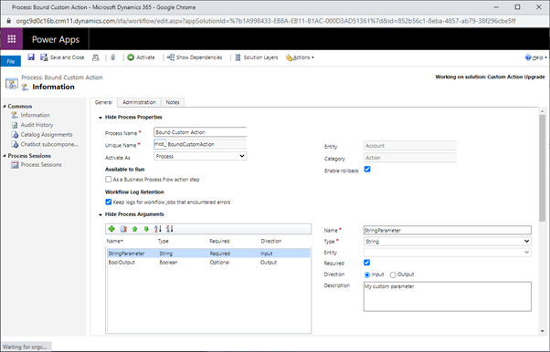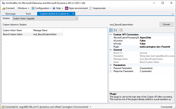 The tool removes the Custom Action and recreates it as a Custom API, preserving all the settings. The name, description, request and response parameters and plugins will all be ported over. If you use the common pattern of having a synchronous, post-operation plugin to implement the logic of the action, the tool will automatically move this to be the “core” plugin for the Custom API.