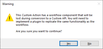 If you have used the workflow engine to add a body to the Custom Action, that part won’t be converted and you’ll need to re-implement it as a plugin to get it to work as a Custom API. The conversion tool detects this however, and gives you a warning to ensure nothing gets lost accidentally: