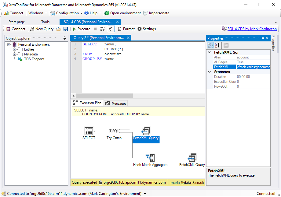 As well as executing the queries, one way I regularly use SQL 4 CDS is to translate SQL to FetchXML for me to reuse in other tools or scripts. You can still access this conversion by clicking on a FetchXML Query node in the execution plan view and opening the Properties window on the right hand side. Alternatively you can double-click on a FetchXML Query node to open the query straight in FetchXML Builder.