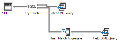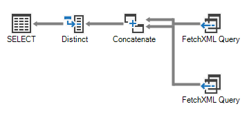 The two FetchXML Query nodes will be executed first and will generate some data which flows to the Concatenate node. This node combines the results and sends it on to the Distinct node. This eliminates any duplicate rows before sending the results to the SELECT node to display it in the grid view. These are the physical operations required to implement the logical UNION operator.