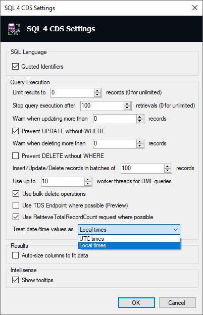- display – SQL 4 CDS will convert the values to the selected timezone before showing them in the grid view