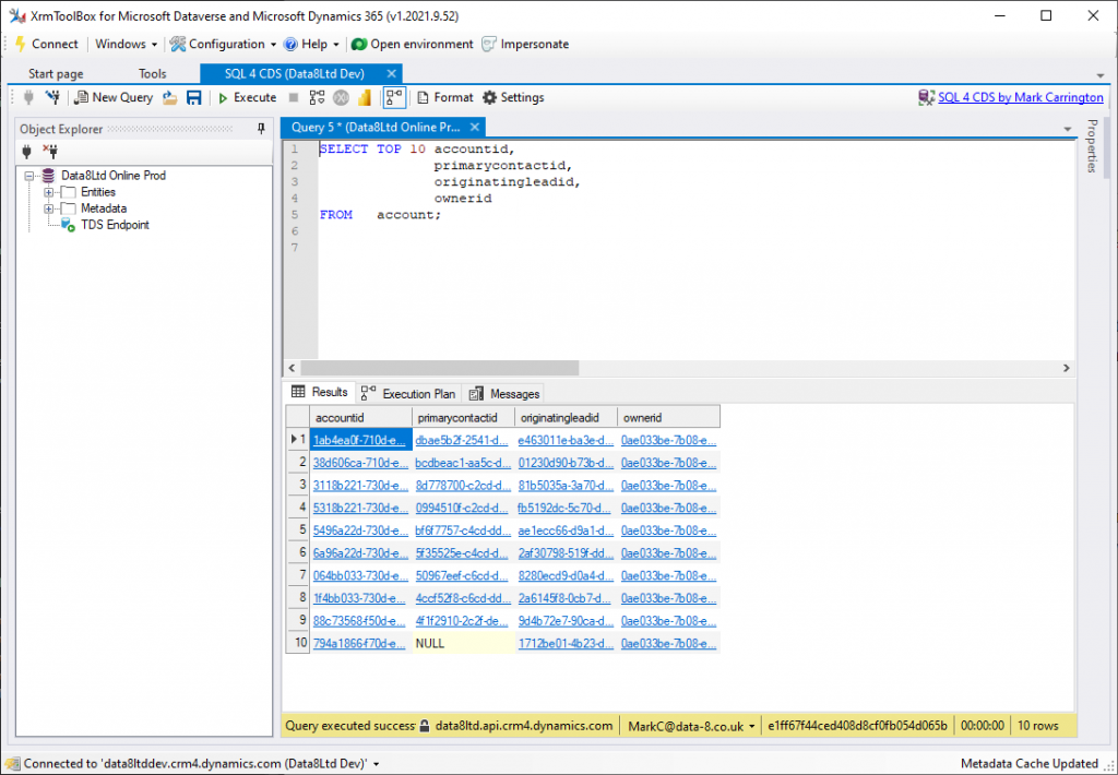 Remember SQL 4 CDS also allows you to query metadata, so this also allows you to check for metadata differences between instances. For example, you could find entities that are missing from your prod environment or where the display name is different using: