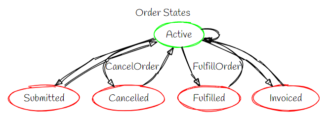 Orders have got a flatter hierarchy of states – from the initial Active state you can go directly to any of the other 4 states. Going to Cancelled state requires using a CancelOrder request, and Fulfilled requites a FulfillOrder request. All the other transitions use a standard Update request.