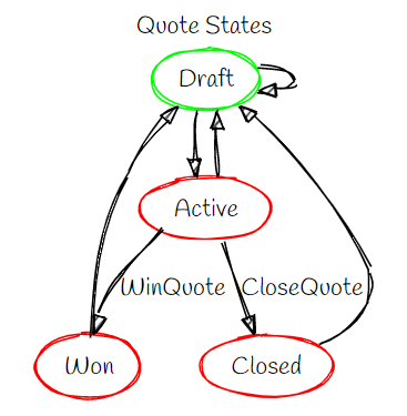 We can also see that to move a quote from the Active to Won state requires using a WinQuote action, while moving from Active to Closed requires using a CloseQuote action. Any of the other state transitions shown can be done with a standard Update request.