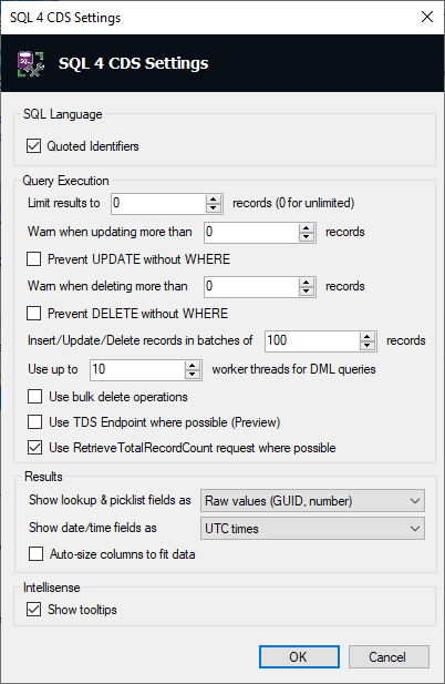 Use the Settings button to control details of how queries are run by SQL 4 CDS.