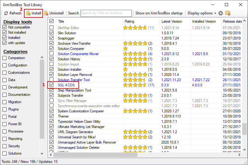 In XrmToolBox, click Configuration > Tool Library. You’ll see list of all the tools you can use in XrmToolBox. Scroll down to SQL 4 CDS and tick it, then click the Install button in the toolbar.