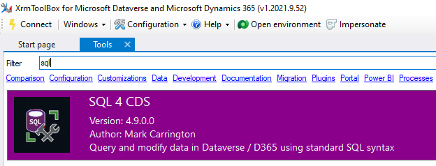 Now you can return to the main XrmToolBox screen. Under the Tools tab you can now search for SQL 4 CDS and click on it to open it.